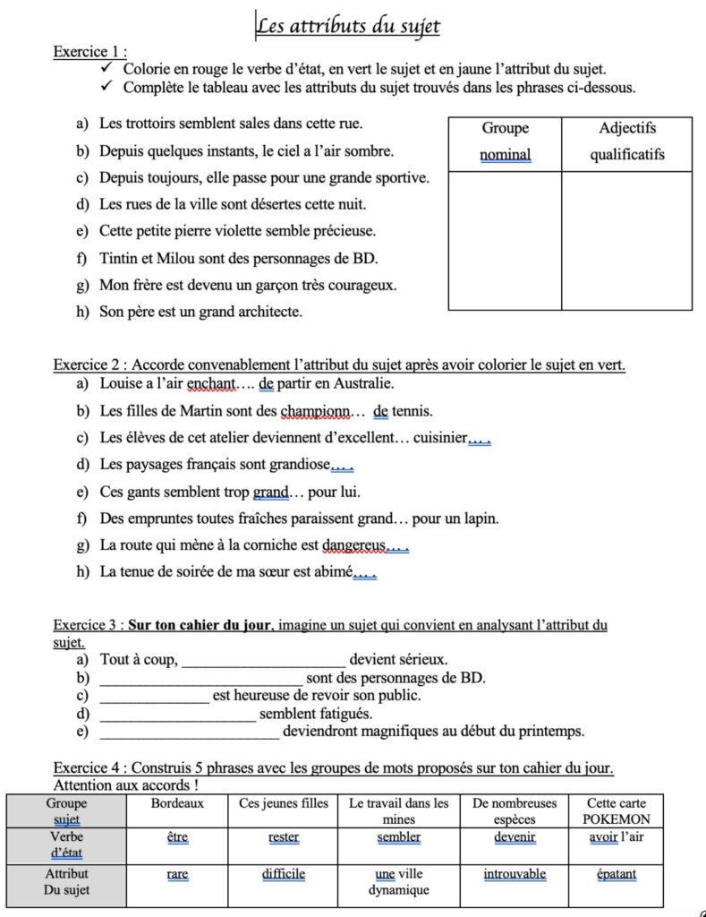 G11 Les attributs du sujet : exercices Série 3 (M Bonelli) + correction