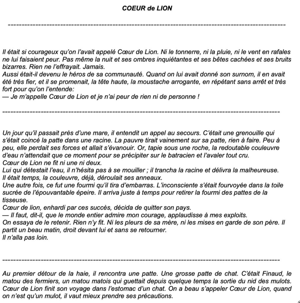 Il était si courageux qu’on l’avait appelé Cœur de Lion. Ni le tonnerre, ni la pluie, ni le vent en rafales ne lui faisaient peur. Pas même la nuit et ses ombres inquiétantes et ses bêtes cachées et ses bruits bizarres. Rien ne l’effrayait. Jamais. Aussi était-il devenu le héros de sa communauté. Quand on lui avait donné son surnom, il en avait été très fier, et il se promenait, la tête haute, la moustache arrogante, en répétant sans arrêt et très fort pour qu’on l’entende: — Je m’appelle Cœur de Lion et je n’ai peur de rien ni de personne !